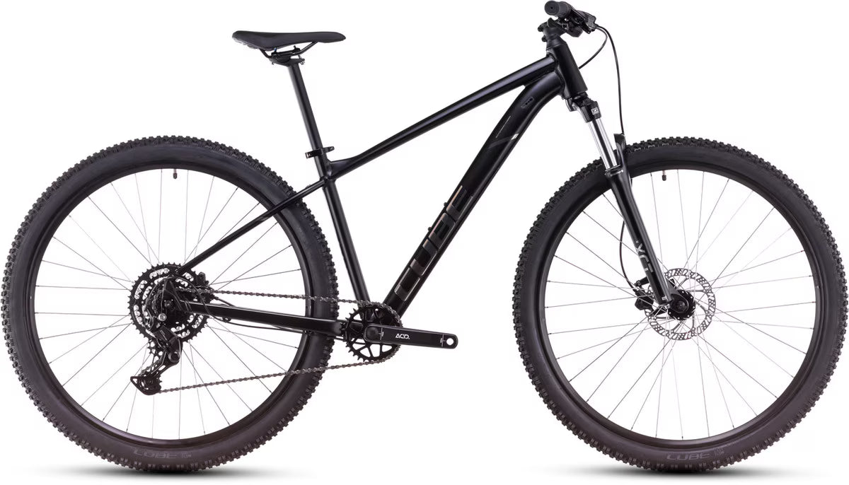 The Cube Aim Pro Hardtail Mountain Bike is designed for rugged trails and adventurous rides. It boasts a durable Aluminium Lite frame with internal cable routing and a 100mm SR Suntour XCT fork for handling diverse terrains. The Shimano Cues 9-speed drivetrain offers smooth gear transitions, and the hydraulic disc brakes ensure reliable stopping power. With tubeless-ready rims and grippy CUBE MTB tyres, it provides excellent traction, making it perfect for trail enthusiasts and recreational riders alike.